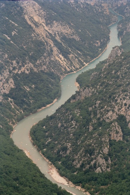 Dzień zaczął się dla mnie o godz. 6.15. Śniadanie „tradycyjne” – cebulowa z makaronem. Ruszam punktualnie o ósmej. Rewelacyjna jazda – cały czas lekko w dół i z wiaterkiem w plecy. Do tego pełne słońce i ten przyjemny poranny chłód... Po 22 km takiej jazdy docieram do St. Andre-les-Alpes. Stąd kieruję się do Castellane jadąc dłuższy czas nad brzegiem ładnego jeziora Castillon. Przejeżdżam przez tamę, która utworzyła jezioro, a później stromo w dół do centrum Castellane. Spędzam tu sporo czasu. Rewelacyjnie wygląda kaplica Notre Dame du Roc wzniesiona na szczycie 184-metrowej skały górującej nad miastem. Jest to główna atrakcja miasteczka, tłumnie zwiedzana przez turystów. Po południu ruszam w dalszą trasę. Mijam kilka kempingów, na których obowiązkowym wyposażeniem jest basen. Droga wzdłuż Grand Canyon du Verdon już na pierwszy rzut oka robi wrażenie. Początkowo prowadzi przy samej rzece. W wielu miejscach daje się dostrzec grupki ludzi kąpiących się i wypoczywających nad wodą. Obowiązkowym wyposażeniem zdają się być rozkładane stoliki i często stojące przy nich parasole przeciwsłoneczne. Kilkakrotnie przejeżdżam przez miejsca, gdzie skały wystają nad całą szerokość drogi. Trasa pnie się coraz wyżej, strome, bardzo wysokie skały są tak blisko, że nieraz mam wrażenie jazdy „ślepą” ulicą, zakończoną skalną ścianą. Widoki są coraz bardziej niesamowite. W końcu osiągam pierwszy punkt wysokościowo-widokowy Point Sublime. Jest tu kilka straganów, na których m.in. sprzedawany jest miód miejscowego wyrobu, jest też parking pełen samochodów. Widać, że jest to obowiązkowy przystanek na trasie wokół kanionu. Jadę dalej. Upał jest nielichy, dobrze jednak, że podczas jazdy rowerem cały czas działa „klima”. Zjeżdżam parę kilometrów, by później z kolei podobny dystans pokonać pod górę. Mijam skrzyżowanie z drogą D23. Nie mam już siły i ochoty zaliczać 23-kilometrowej pętli prowadzącej brzegiem kanionu, a osiągającej znaczne wysokości. Przy dzisiejszym upale to nie dla mnie „zabawa”. Nie pomaga nawet świadomość, że po wyprawie będę żałował, że nie zdobyłem się na ten dodatkowy wysiłek. W La Palud „szaleję” w sklepie. Kupuję puszkę zimnego piwka, kawałek arbuza, mleko i bagietkę płacąc za wszystko niecałe 5 euro. Później jeszcze chwilę jadę pod górę i zdobywam przełęcz Col d’Ayen (1032 m n.p.m.). Mijam ogromne fioletowe pole lawendy. Zapach jaki się tu unosi przyprawia o zawrót głowy. „Bezboleśnie” zaliczam jeszcze jedną przełęcz – Col de l’Olivier (711 m n.p.m.) i oczom moim ukazuje się piękny widok. Daleko w dole rzeka Verdon robi się szersza i wpada do jeziora Lac de Ste. Croix. U ujścia rzeki daje się zauważyć dużą ilość jednostek pływających – kajaków, pontonów, rowerów wodnych, łódek itp. Przy jeziorze znajdują się wypożyczalnie sprzętu pływającego, z których korzysta bardzo wiele osób, zapuszczając się później nawet kilka kilometrów w głąb kanionu. Mijam kilka punktów widokowych oferujących wspaniałą ucztę dla duszy. Droga długą pętlą sprowadza nad brzeg jeziora. Od tej strony jest super widok na ujście rzeki, która wypływa spośród ogromnych, ciasnych skał. Zatrzymuję się na chwilę na moście przerzuconym przez rzekę. Stąd jest doskonały widok na ludzi pływających na różnorakim sprzęcie lub wpław. Co odważniejsi skaczą do szmaragdowej wody z wysokich skał. Przejeżdżam przez most i pomimo licznych tablic zabraniających biwakowania na dziko postanawiam przenocować nad brzegiem jeziora. Idę na kamienistą plażę, gdzie najpierw jem kolację, a później pływam godzinę w ciepłej wodzie. Towarzyszy mi przy tym piękny zachód słońca – prawdziwa sielanka. Gdy już się nieco ściemniło, a słońce zostało zastąpione przez księżyc w pełni, oparłem rower o rosnące nad brzegiem małe drzewka, a sam rozścielam materac, śpiwór i worek biwakowy, w którym układam się do snu. Po całym upalnym dniu i noc jest gorąca, przez co długo nie mogę zasnąć. Na dodatek niedaleko stąd kilka osób urządziło sobie imprezę. Głośne radio, a do tego ktoś wytrwale przez kilka godzin przygrywa na tam-tamach. Śpiewy i krzyki przeciągają się do godz. 1 w nocy. Dopiero wówczas, sam nie wiem w którym momencie, udaje mi się zasnąć.